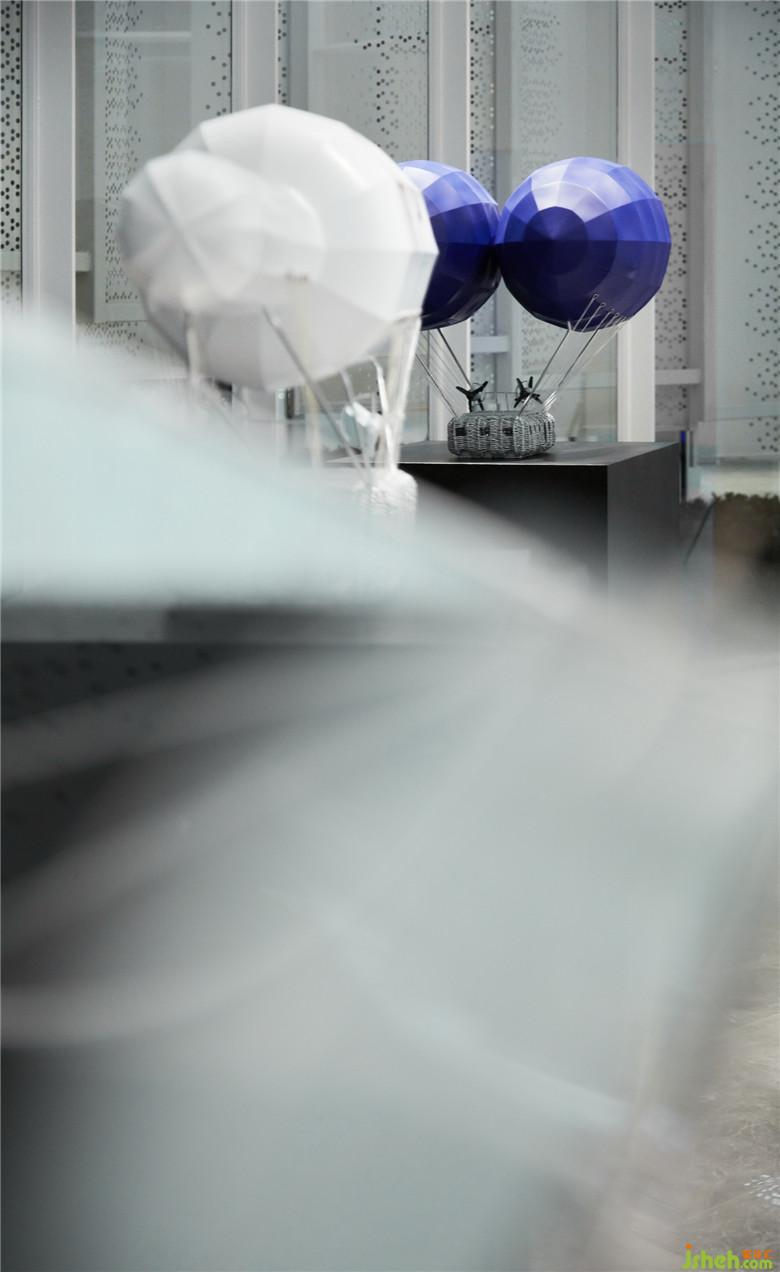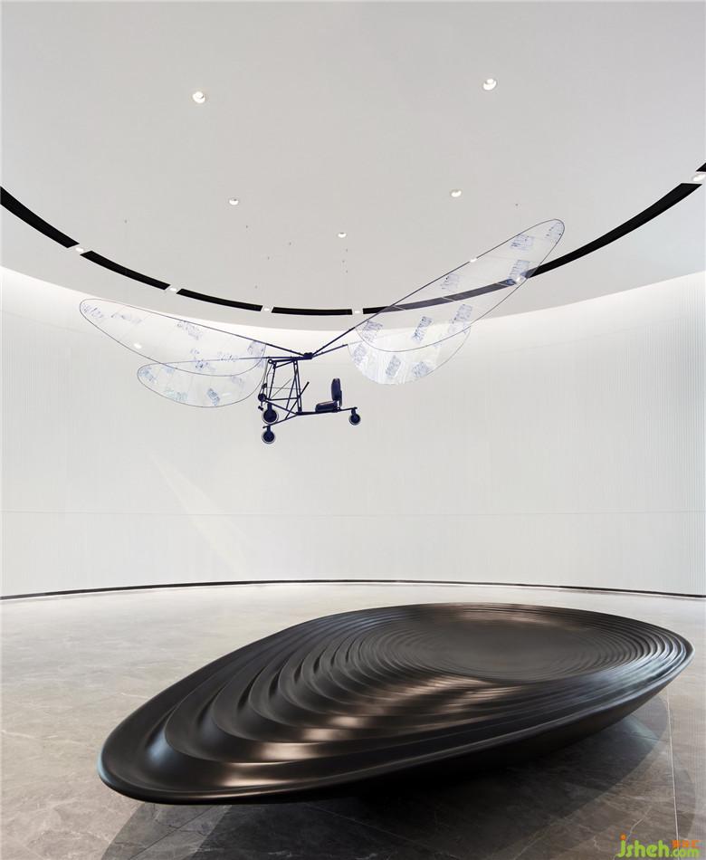 當(dāng)天空邂逅科技,飛行是永恒的旋律。共生形態(tài)以“飛行”為線索挑選相關(guān)藝術(shù)品與裝置,并以之關(guān)聯(lián)、穿透各個空間,形成清晰的導(dǎo)向系統(tǒng)。從前臺接待、區(qū)位展示、多媒體室到藝術(shù)長廊,空間層層遞進,故事逐次展開:前臺錯位懸掛的燈具,精美的圓形結(jié)構(gòu)宛如片片云朵漂浮,奏響空間序曲;環(huán)形幕墻下擺放的魔法飛行器,啟發(fā)觀者產(chǎn)生聯(lián)想;天花上的弧形燈槽似飛行的軌道,而大型飛行器就懸于半空;藝術(shù)長廊擺放著各式熱氣球及飛行裝置模型,墻身的手稿畫、黑白照片記錄著其誕生的歷史;沙盤區(qū)上方設(shè)置藍色天鏡裝置回應(yīng)“天空”主題,鏡面反射作用突顯了整體空間的未來科技感,使每個區(qū)塊都有了特有的影子,形成空間獨有的記憶點。會所設(shè)計