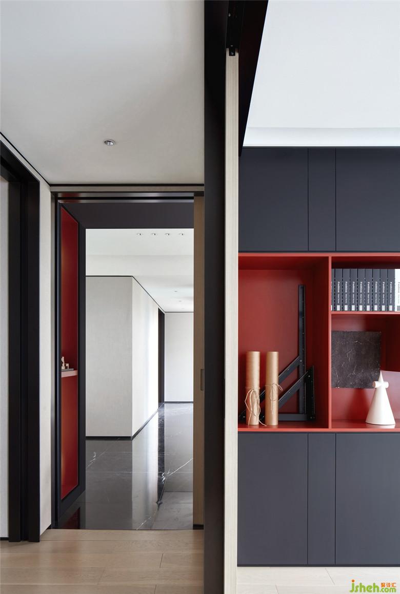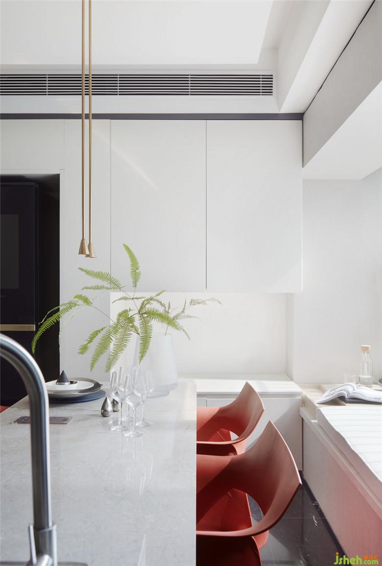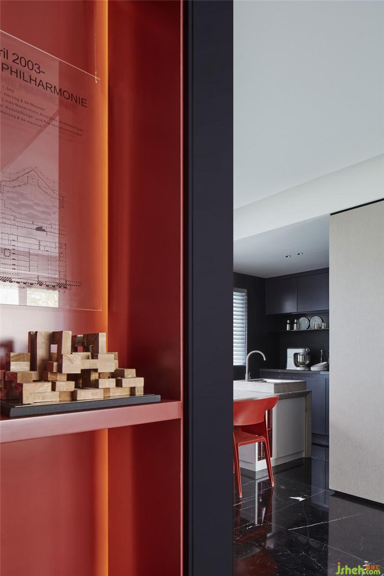 開放式廚房與餐廳二合為一,它們與沙發(fā)區(qū)相對,建構(gòu)出一個(gè)歡快交融的互動性起居場景。紅藍(lán)主調(diào)的空間配色使人想起蒙德里安的風(fēng)格派畫作,強(qiáng)烈原色的構(gòu)成中暗含生活邏輯。