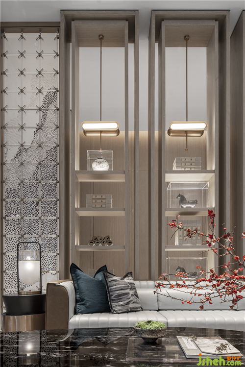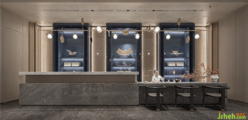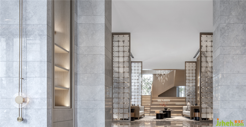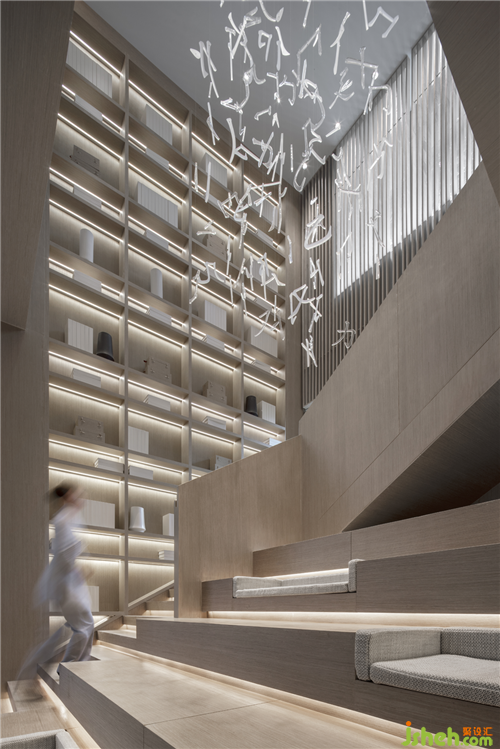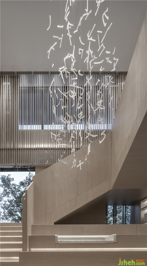 溫嶺地處溫黃平原,四山一水五分田的地貌,孕育出當(dāng)?shù)厝说纳罹爸屡c傳統(tǒng)風(fēng)俗。得靈感于此,三盛璞悅府銷售中心,入口玄關(guān)墻如海中山島,將空間如畫卷般橫向展開,而梯間懸吊的文字圖騰又將空間向上拉升與引導(dǎo),橫、縱向空間層次得以擴(kuò)展,人的視線亦因之得以拓寬。