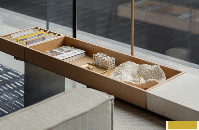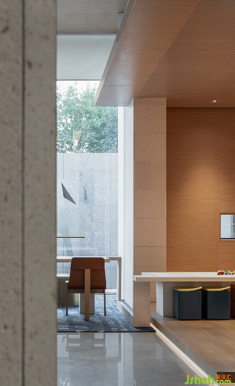 泉眼流水落在水面上,形成一片光影錯動,倒映天花之上,形成另一番生動的景致。木色天花如同嵌于天上的水道,將人的視線引向空間深處。