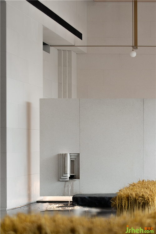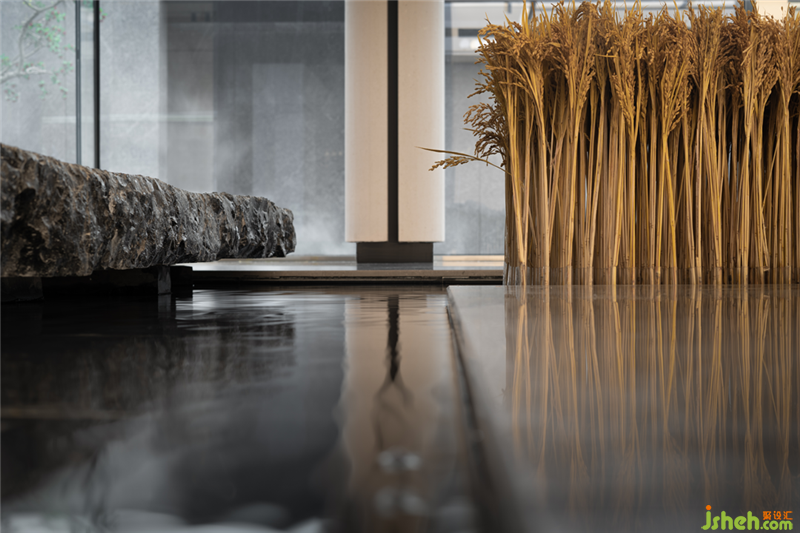 泉眼潺潺,曲渠鱗鱗,與室外的池景連成一片水域。釀黃酒的稻米與重達數(shù)噸的黑山石安置室內(nèi),傳遞關(guān)于時間的詩意。展廳裝修設(shè)計浪淘猶見天紋在,一石攬盡太古風。巖石的肌理藏著時光流逝的聲響與印痕,潛移默化將觀者帶入意境之中。