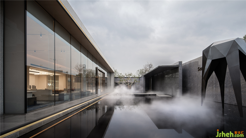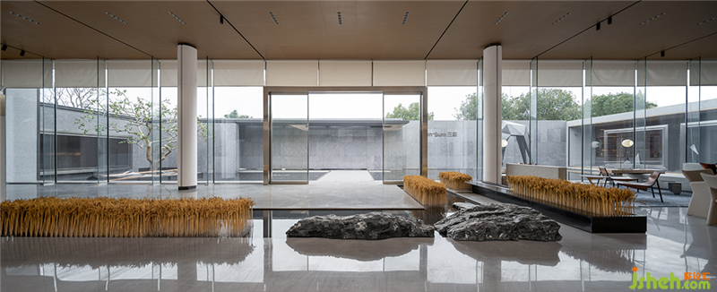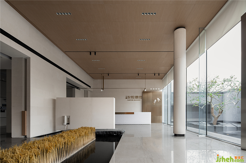三盛汝悅璟園銷售中心,地處紹興大越路東側(cè)。室內(nèi)從零開始介入,與建筑、園林同步展開設(shè)計。建筑用圍墻隔離馬路的嘈雜,創(chuàng)造出靜謐的內(nèi)院式景觀。室內(nèi)設(shè)計與園林水景互為借景,設(shè)計師通過對景設(shè)框、借框得景,實現(xiàn)內(nèi)外空間的滲透和流動。