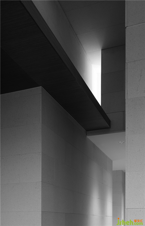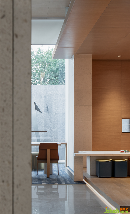 從原石,到半成品石,再到人造石板,銷(xiāo)售中心設(shè)計(jì)師以材料建立起三重時(shí)間的演進(jìn)。接待臺(tái)的磚體晶瑩里泛一點(diǎn)黃,如同稻米映照在陽(yáng)光之下。磚體相對(duì)脆薄,采用室內(nèi)裝修的手法拼砌,磚體必不能承其重,因此改用建筑手法排砌,意外使得磚體質(zhì)感更顯。走廊轉(zhuǎn)角處,設(shè)計(jì)師原想開(kāi)一個(gè)面東的天窗,讓光影可以流轉(zhuǎn),囿于客觀條件未能實(shí)現(xiàn)。改而研發(fā)出一種水泥板,以創(chuàng)造從明亮到柔和的漫反射光線。水泥板采用交錯(cuò)咬合的方式搭砌,交接處可清晰見(jiàn)到材料的厚度。