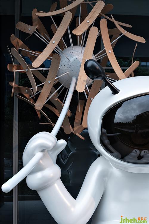 裝置手持的蒲公英和竹蜻蜓燈連接成一個(gè)動(dòng)態(tài)的畫面,由展廳外延伸入內(nèi),連接起兩個(gè)空間,有效拓展了視覺深度。