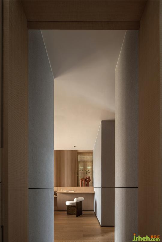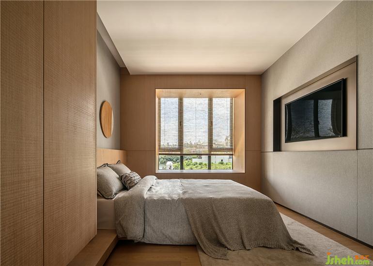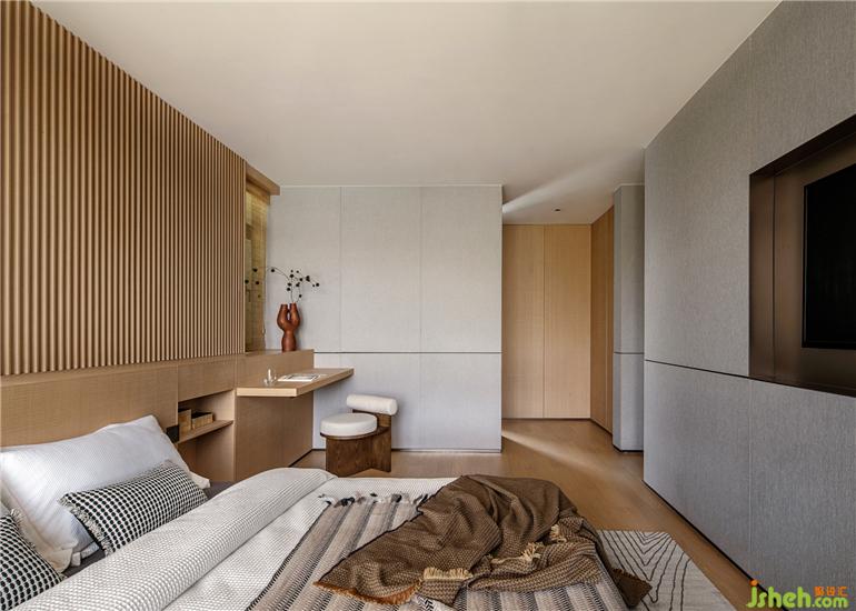 主臥床頭背景結(jié)合開窗形成了極具特色的嫻靜光影。背景窗的開合留下一線縫隙,別墅設(shè)計(jì)輕而易舉點(diǎn)燃了整個(gè)空間的情感,內(nèi)里卻充滿了隨性、溫暖、活潑的意趣。正如加斯東?巴什拉所言——所有的庇護(hù)所,所有的藏身處,所有的臥室,都有共同的夢(mèng)境價(jià)值。