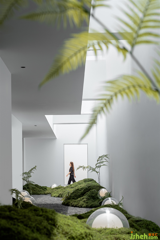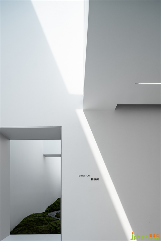 幾套樣板房共用的開敞景觀面是一個(gè)微縮的園林小徑,直面二層樓梯的開口將人們帶入一個(gè)情境的起始——整個(gè)景觀變成另一個(gè)“洞天”。