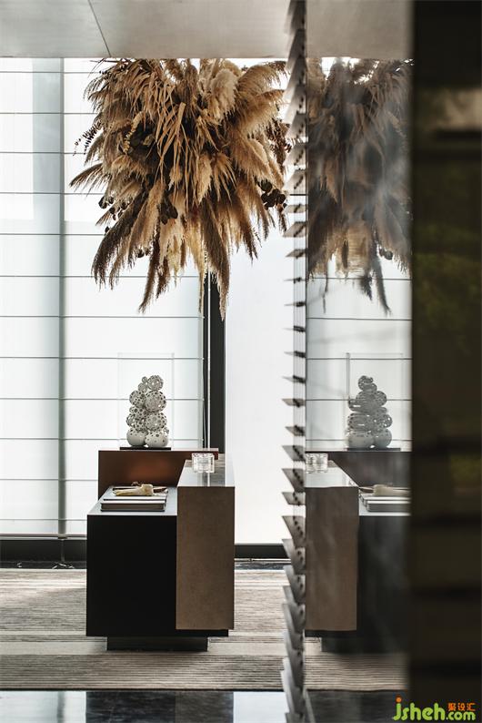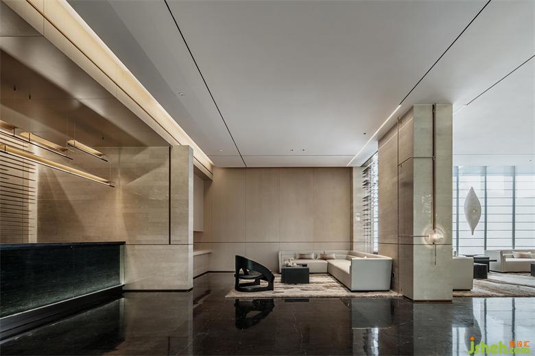 公區(qū)設(shè)計(jì)師確立了以水為線索、用材質(zhì)對(duì)比在空間中表達(dá)出溫潤和有人情味的生活氣息,用酒店大堂的視覺感受體現(xiàn)出生活品質(zhì)的設(shè)計(jì)策略。