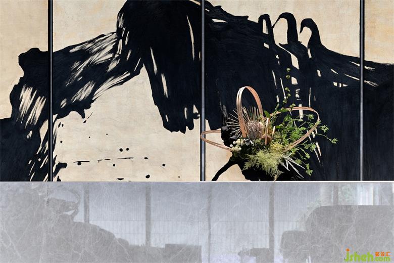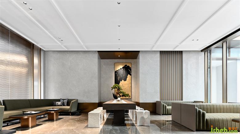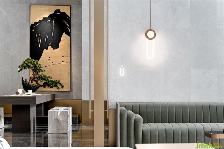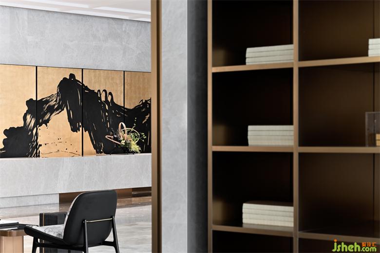 運用深淺兩種石材營造傳統(tǒng)水墨畫中虛實濃淡的視覺感知意境,呈現(xiàn)出一種儒雅式的靜謐。而工藝玻璃與霧化金屬的應用,則給空間平添了幾分現(xiàn)代美學氛圍與輕奢品質感。
