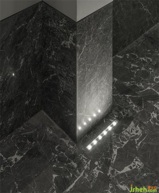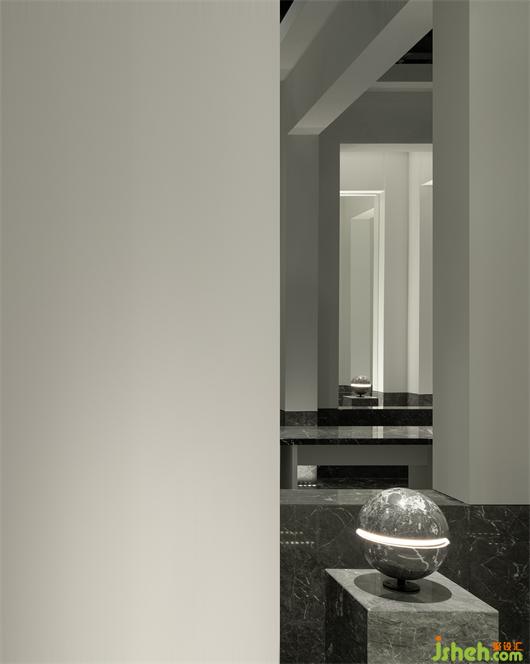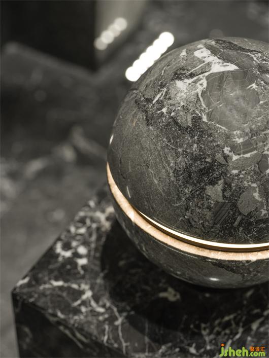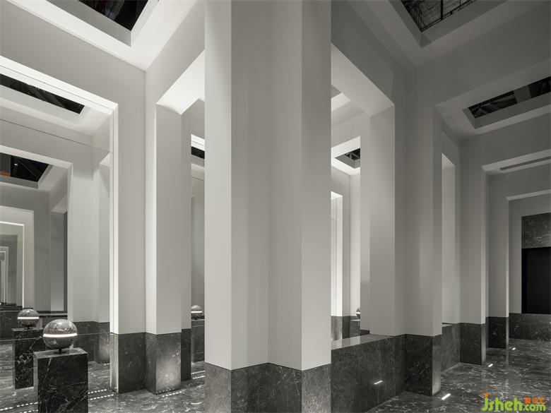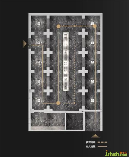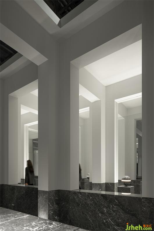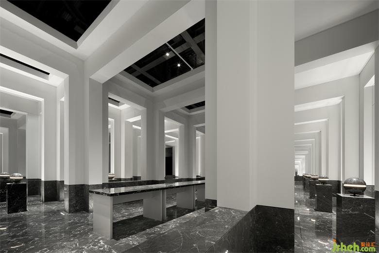受帕特農(nóng)神廟空間構(gòu)成的啟示,展廳平面的核心空間與外圍廊柱形成一種神圣的陣列,展廳設(shè)計(jì)中軸對(duì)稱的布局展現(xiàn)出豐富的空間層次。行進(jìn)流線區(qū)域間放置的大理石裝置對(duì)應(yīng)著石材的未來(lái)感,在框景之中,為空間與人的交流、互動(dòng)罩上一層神秘色彩。