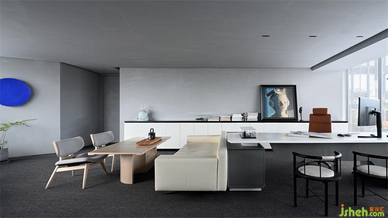 辦公總部設計在平面布局中,白色沙發(fā)以反常規(guī)的方式背靠橫向延伸的辦公桌一端,形成中島組團結(jié)構(gòu),既使得空間秩序干凈明確,也為入口留出充足的動線空間。