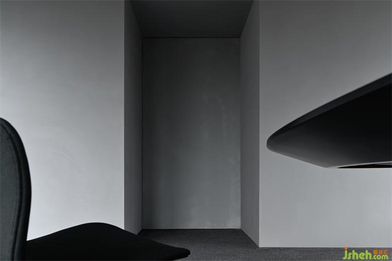 如此,辦公總部設(shè)計(jì)以灰色的推拉門(mén)為界,將日常的辦公區(qū)域退守在相對(duì)規(guī)整的梯形空間之中,消解三角結(jié)構(gòu)對(duì)空間感受力的干擾。