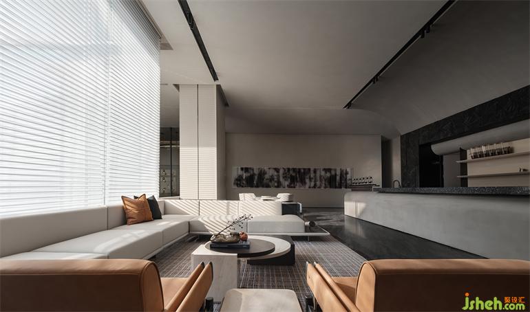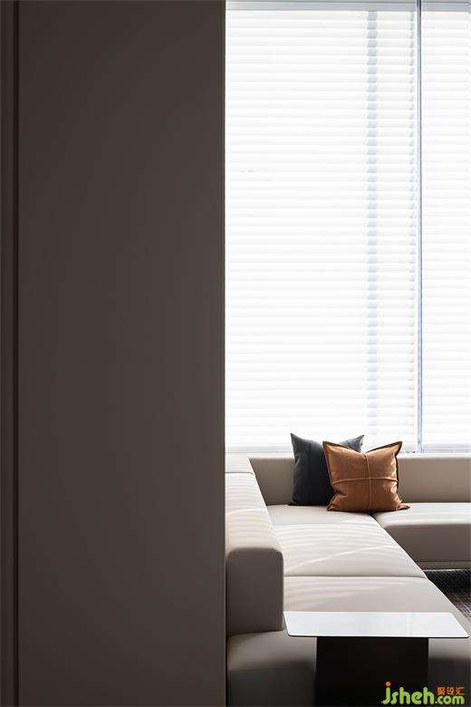 沙發(fā)座椅區(qū)位于沙盤與咖啡吧臺(tái)的對(duì)面,這里的空間重心開始微微下移,巨大的玻璃幕墻在其后,投下溫暖和煦的光斑,一種安靜的情緒縈繞其間,暗示為某種柔軟的、可以安放心身的歸屬感。
