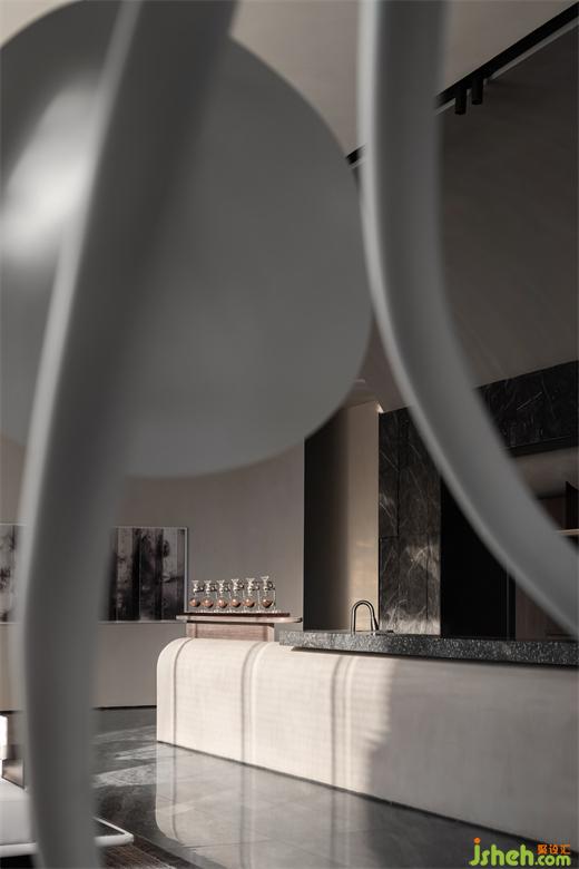 沙盤區(qū)域咖啡吧臺(tái)在前續(xù)的位置上相連,確立著空間動(dòng)線的方向。與此同時(shí),巨大的微水泥弧形曲墻面構(gòu)筑物,銷售中心設(shè)計(jì)將沙盤與咖啡吧臺(tái)微微向內(nèi)包裹,營(yíng)造出輕松而熙攘的都市街頭氛圍。