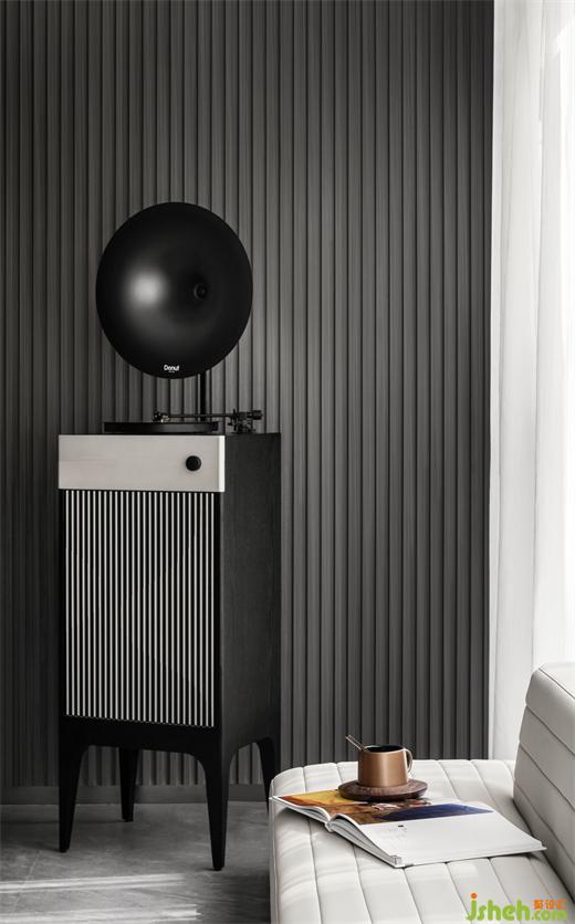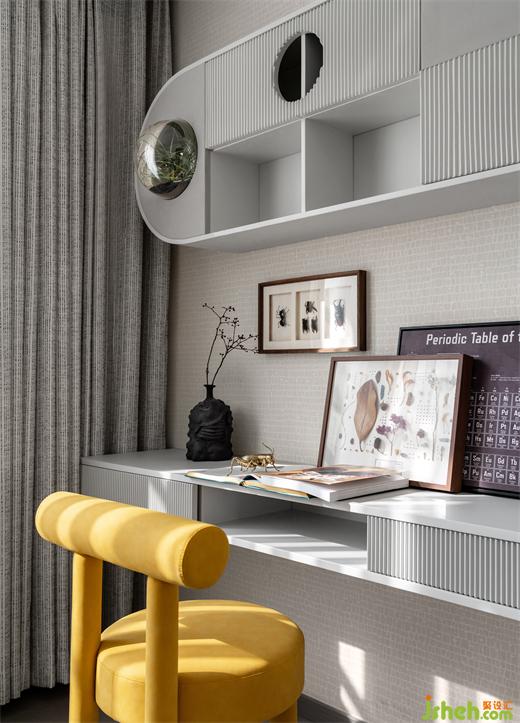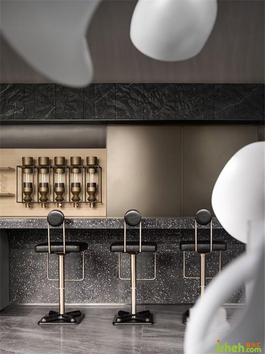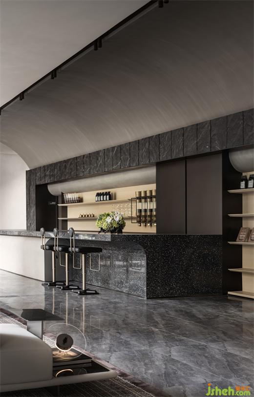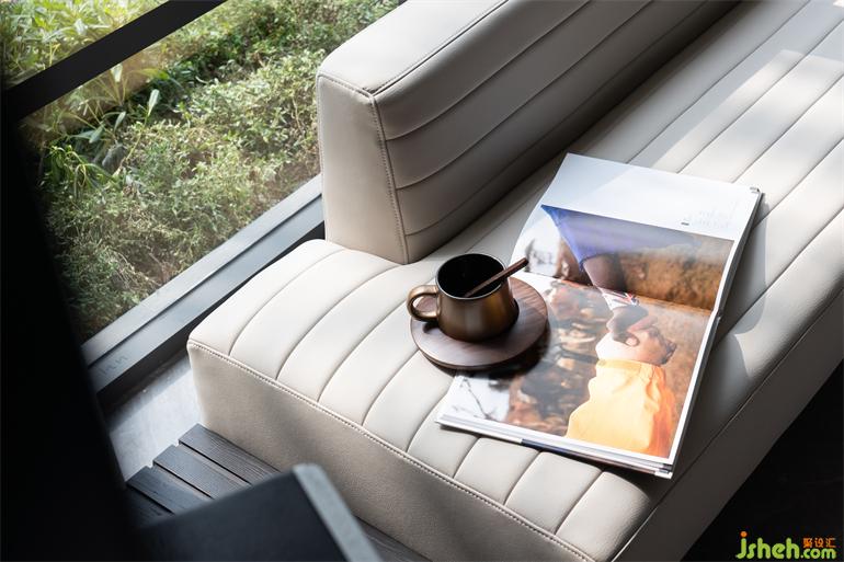 在附一層的公共活動區(qū),老式打字機、電影膠片、老式電影放映機等眾多老物件,銷售中心設(shè)計以藝術(shù)收藏的方式進入空間細節(jié);帶有古典意蘊的書案和置于中心位置的火塘,則以傳統(tǒng)的形態(tài)參與進現(xiàn)代生活。位于空間最內(nèi)側(cè)采光天井,使得陽光洗墻而下,現(xiàn)在時與過去時交融,新的感知被某種瞬時性所激活。
