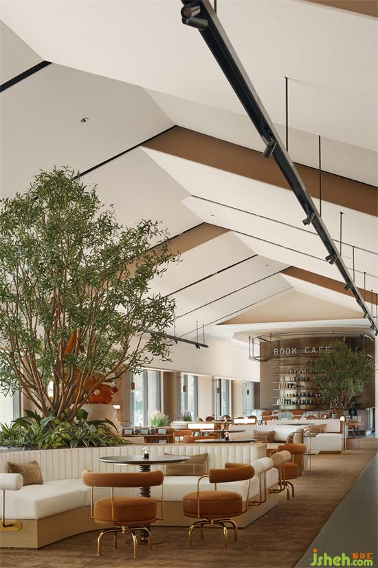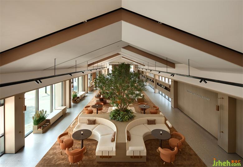 空間之中兩株直通頂部的樹形成了軟裝關系的中心,圍繞著兩棵樹,形成了各自的交談場景。銷售中心設計坐在其間,仿佛歲月穿梭,拉回到曾經在樹下捉蟬,彈彈珠的時光??臻g與人、人與人的距離迅速被拉近、包裹。