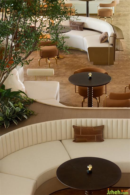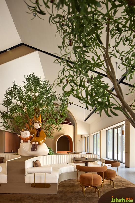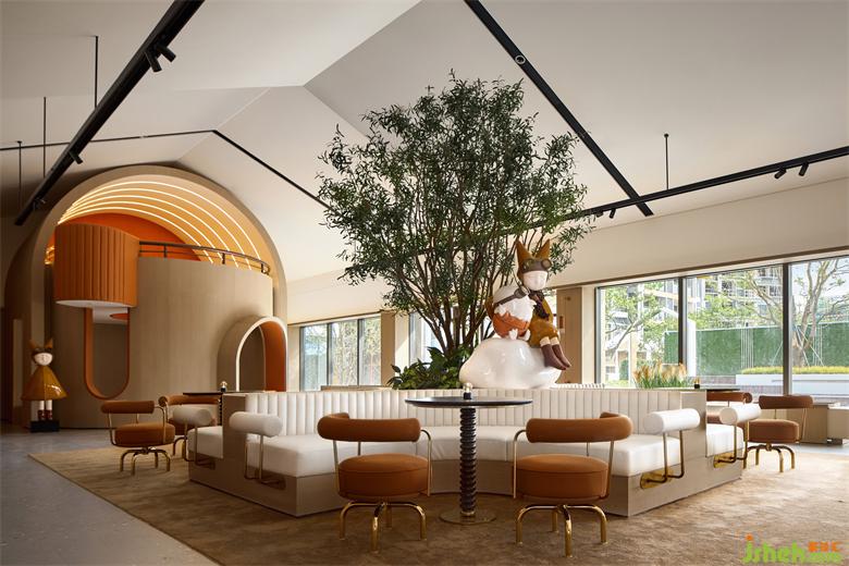 空間的秩序是幾何的,而內部的關系組織卻多用弧形。銷售中心設計在長空間中,設計師設置了兩個節(jié)點——分別是圓形咖啡吧臺,和“樹屋”兒童區(qū),讓這些功能模塊成為空間轉化關系的交叉點,同時梳理空間秩序,完成不同場景之間的界面處理。