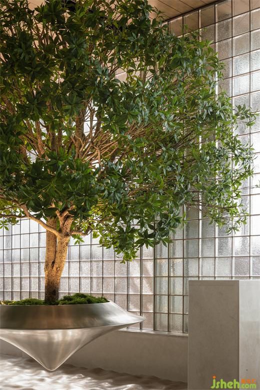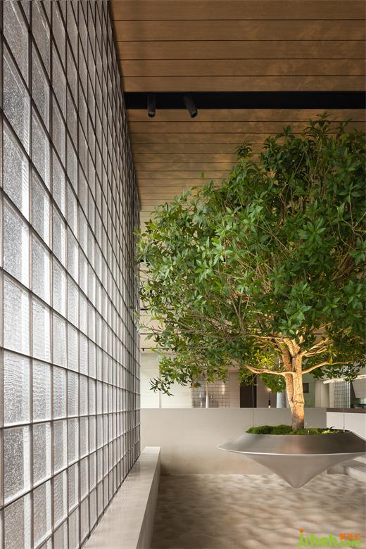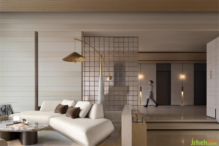 暖黃的燈光與溫和的石材在前廳接待臺彌合出一種謙和的氛圍。天際會所設(shè)計半隔斷的玻璃墻帶著些許氤氳,目光盡端以自然植被的綠色拉長了對視線的吸引,喚醒城市旅人記憶中的某個瞬間,從而誘出情緒。