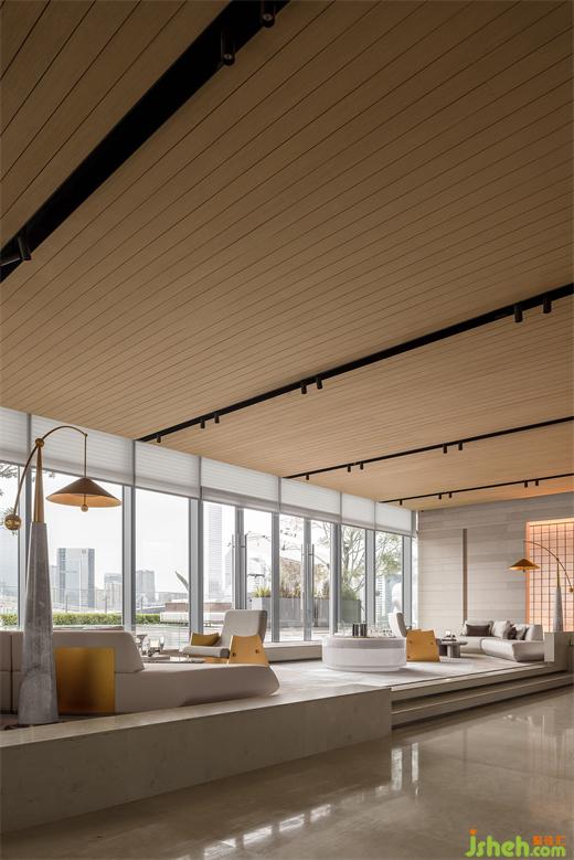 洽談區(qū)域在此形成一種觀望方向上的轉(zhuǎn)變,同時以整體抬高的尺度變化與戶外平臺相互呼應(yīng),猶如一個以城市天際線為背景的舞臺,將城市中軸的絕佳輪廓呈現(xiàn)。