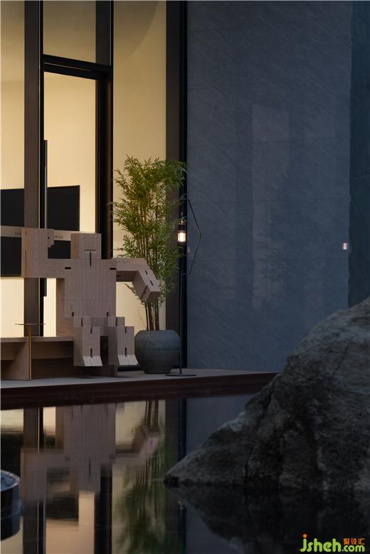 旋轉(zhuǎn)樓梯就像一顆巨大的“綠色心臟”,包裹起中間懸掛的藝術(shù)宮燈裝置,使得核心空間具有垂直向上的動勢。保利成都和頌售樓部設計宮燈的設計理念源自對情感、時間和記憶的梳理。成都銀花絲手工藝及國遺皮影將時空壓縮,外層帷幔透紗內(nèi)芯發(fā)光將內(nèi)層民俗匠造的微觀世界展開,三星堆、都江堰、絲綢之路、宗教信仰、移民匯聚、市井生活、熊貓基地,從古至今逐第呈現(xiàn)。