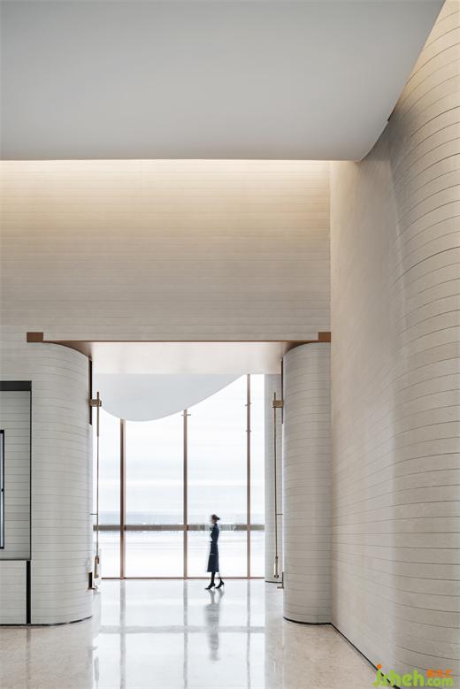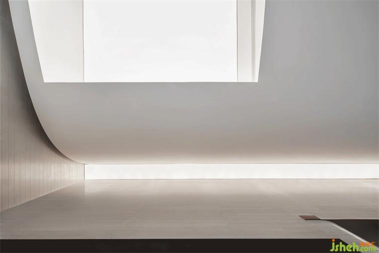 比風景更重要的,是看風景的角度。借鑒何陋軒的建筑手法,室內(nèi)大弧形天花里高外低,看向戶外的視線被刻意壓低,而人在步入空間之始會有豁然開朗之感。洽談區(qū)高低錯開,避免不同位置的視線遮擋,同時模糊里外空間界限。抬高區(qū)域將水景盡納目下,下沉區(qū)域親近水池,每當清晨霧氣氤氳,身臨其境恍若置身瑤池仙境。