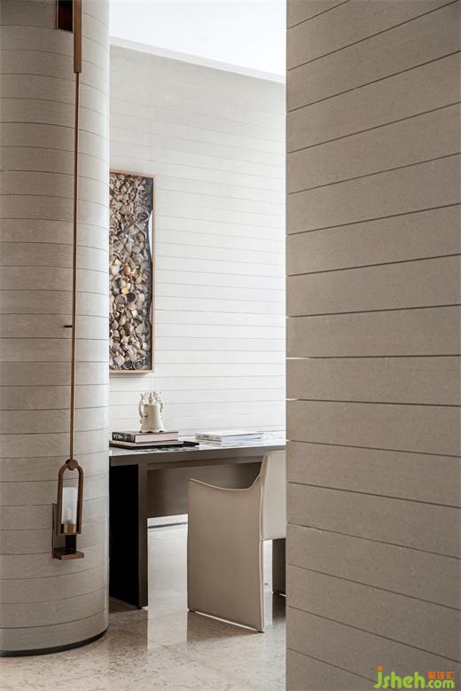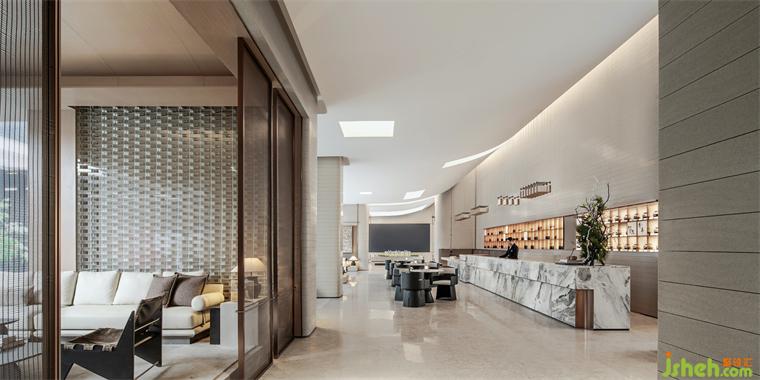 空間核心路徑環(huán)繞中央水池鋪陳,集中詮釋人與空間、人與自然、人與生活的關系。成都保利錦城和頌體驗中心裝修設計沒有復雜的造型與色彩,沒有繁瑣的材料與構造,精心組織的燈光有如天光灑落,與變化的自然光互補成為空間最生動的表情。為實現(xiàn)簡約明快的氛圍與細節(jié),設計師選擇如定制人造石、玻璃磚等特色材料完成表達。