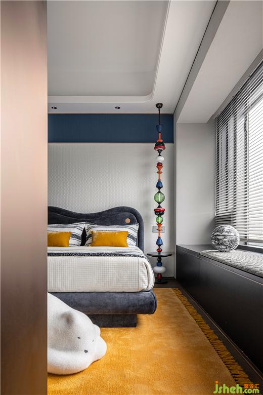 主臥空間延續(xù)著公共空間的自由布局。開放式衣帽間,半落地景觀面,為空間帶來舒展的情緒,而大量的細(xì)節(jié)陳列和柔軟的織物,則豐富了空間的肌理與質(zhì)感。