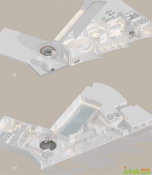 如一場(chǎng)劇幕,空間主入口自地下一層開(kāi)啟,初始,樹(shù),即定義了人與自然環(huán)境間的親疏。售樓處設(shè)計(jì)玻璃圍廊形成環(huán)繞的公共空間,天光與樹(shù)影創(chuàng)造一種開(kāi)放、互融的景觀環(huán)境。斑駁中,自然以一種具象化的形式呈現(xiàn)在人們眼前,環(huán)繞的汩汩水流象征四水歸堂。