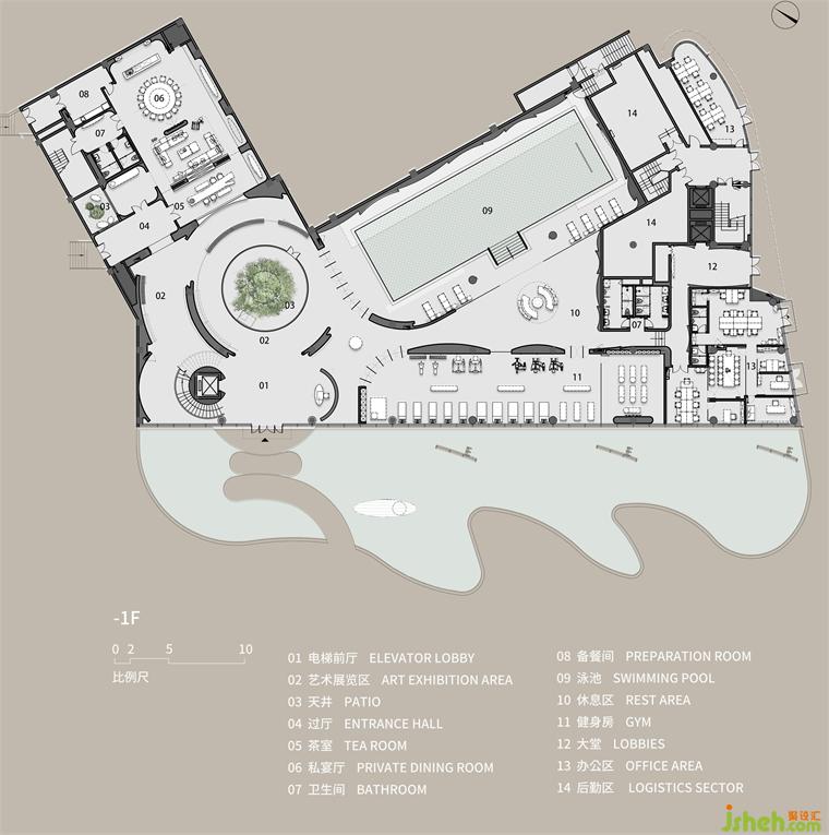 “游墻”如固態(tài)的云霧,給予人控制性的游走與觀看。平面功能上的功能排布,讓空間形成一種疊合的關(guān)系,造就了深與遠(yuǎn)。在“有限的觀看”中釋放出一種適度的遮掩、相對(duì)自然,功能獨(dú)立卻又相互勾連的氤氳之息。