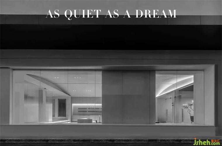 展廳側(cè)面面向園內(nèi)道路,大玻璃櫥窗的巧妙設(shè)計(jì),展廳設(shè)計(jì)把外立面的不利條件包裹,使室內(nèi)日與夜的不同氛圍如海報(bào)畫般隨時(shí)間流逝而切換呈現(xiàn)。此刻如隱歸于此,感受時(shí)光緩緩流轉(zhuǎn),如夢(mèng)恬靜。