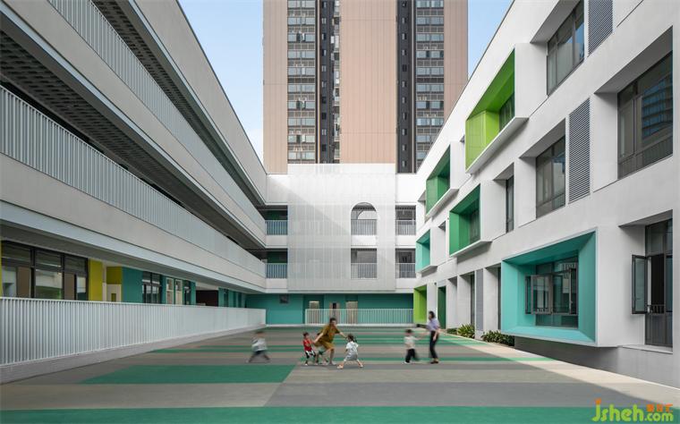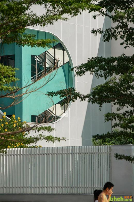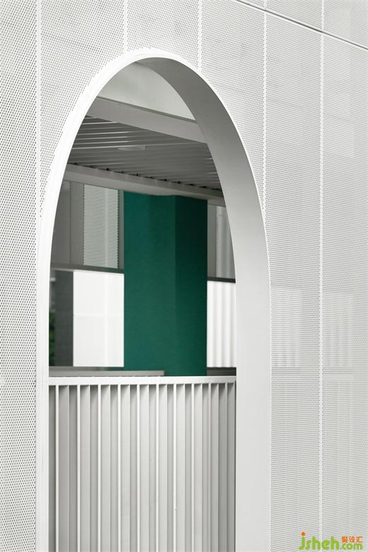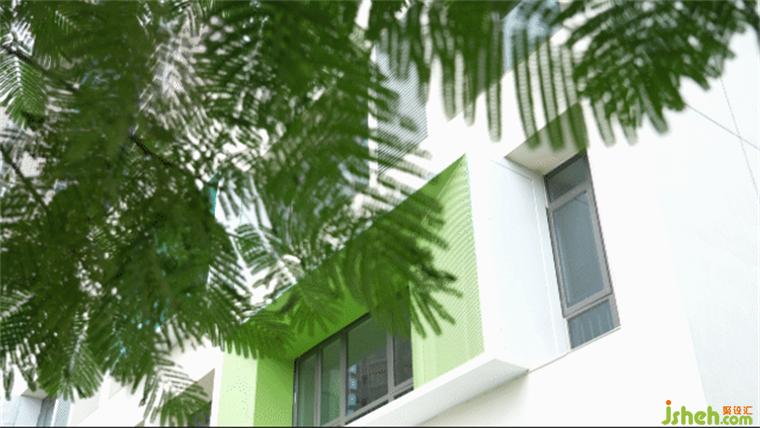 幼兒園設計金屬沖孔網(wǎng)如紗網(wǎng)一般,輕盈而具有呼吸感,既有效地遮蓋了原建筑結構的缺點,又因空隙過濾著光的形態(tài),捕捉著光影的變化,而金屬沖孔網(wǎng)上挖出的圓與橢圓的造型,則更進一步豐富了搖籃的具體形態(tài),并使之趣味盎然。