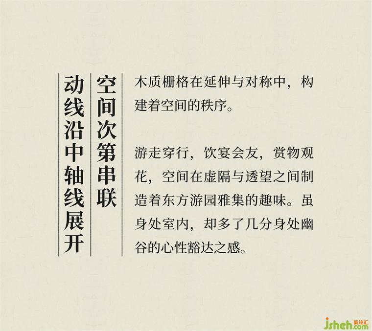 游走穿行,飲宴會友,賞物觀花,空間在虛隔與透望之間,制造著東方游園雅集的趣味。雖身處室內(nèi),卻多了幾分身處幽谷的心性豁達(dá)之感。