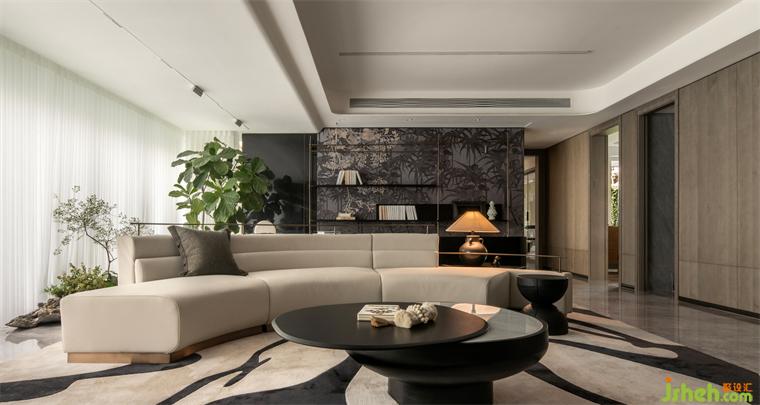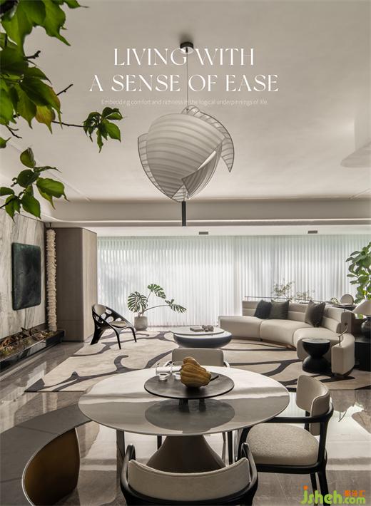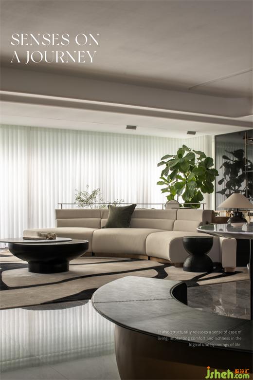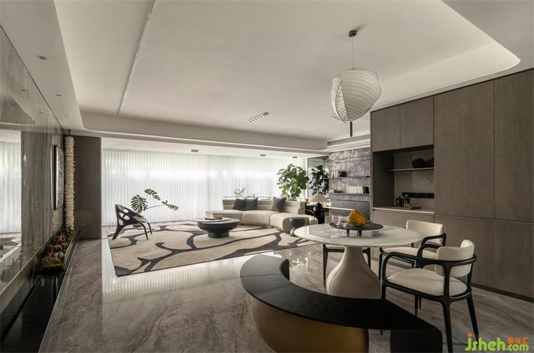樣板間設(shè)計將原有的封閉式廚房打開,延展整個客餐廳在視覺上的縱深關(guān)系,形成一個延續(xù)性整體,并在區(qū)域功能的逐漸變化中,產(chǎn)生一種由緊向松疏導(dǎo)的空間秩序。