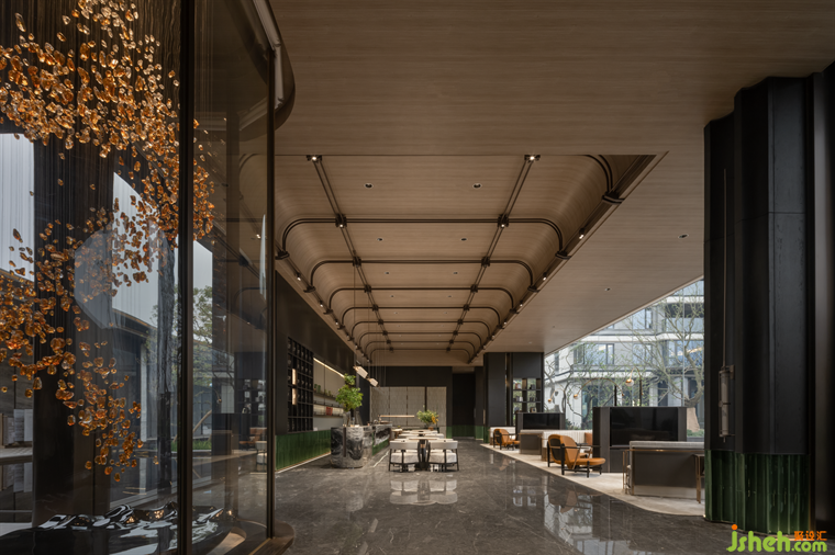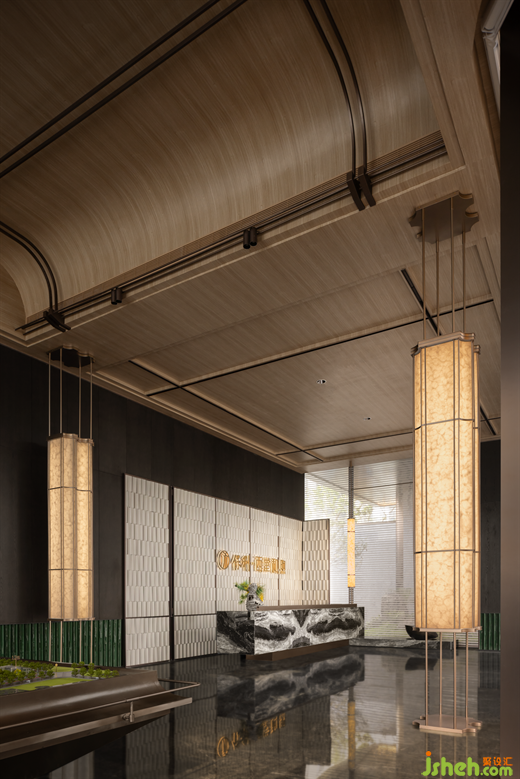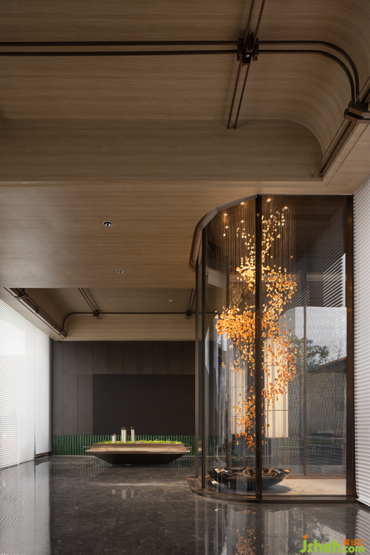 取自傳統(tǒng)建筑元素的斗拱結構,售樓處設計以金屬材質隨拱頂輪廓呈現(xiàn)。拱頂形態(tài)的提取與舊時商人會館或街道旁的涼棚呼應,結合前臺的石紋,在游走中為空間的儀式感定調。