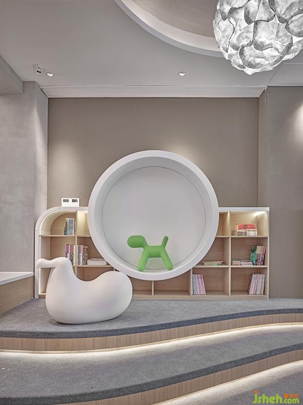 沙盤區(qū)的另一側是寓教于樂的兒童活動室,在弧形趣味的書墻造型下,運用意大利家具品牌ME TOO與LEGO結合,童趣而不失爛漫。