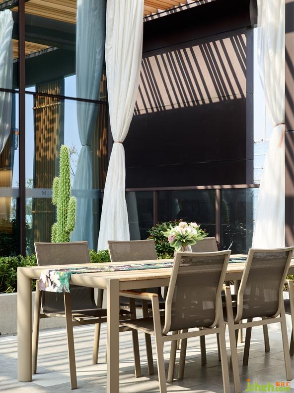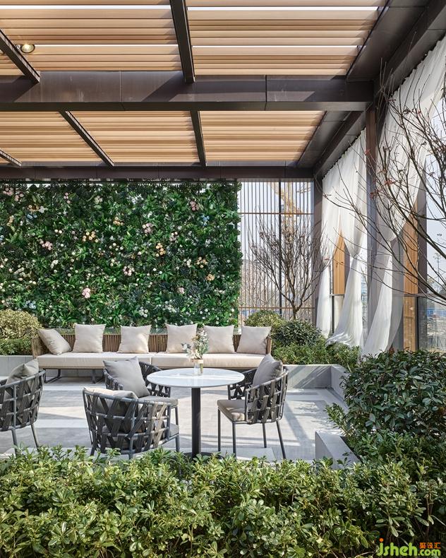 進入二層映入眼簾的是通透溫馨的太太廚房,長條的開放式操作臺便于烘焙與交流,使整個空間互動且活潑。半透明墻面上的女性形象涂鴉充滿活力,張揚且突出主題,簡潔的線條配合花卉裝飾,給予當代女性全面的詮釋和表達。走出戶外,一片生機盎然的景象是野獸派花園的陳列。這個半開放式空間由遮陽頂與紗簾為邊線,戶外沙發(fā)套組的背后是一整面花草墻,與三五好友在此喝個下午茶聊聊天,雅致而沁心。