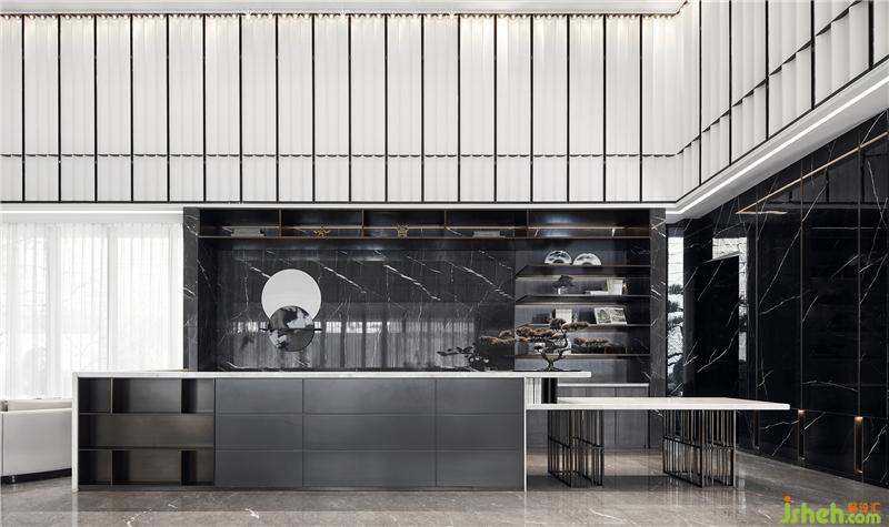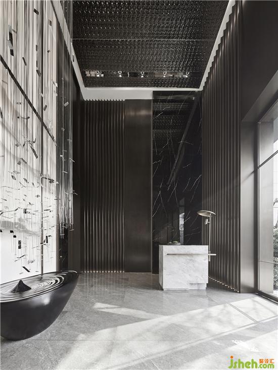超白夾絹玻璃映襯出一幅“浮萍破處見山影,小艇歸時(shí)聞草聲”的悠然畫卷。光線從吊頂波紋不銹鋼的邊緣沿線條垂流而下,凝固在水滴漣漪的藝術(shù)裝置上,使人走入其間,如與自然共棲,相得益彰。會(huì)所設(shè)計(jì)