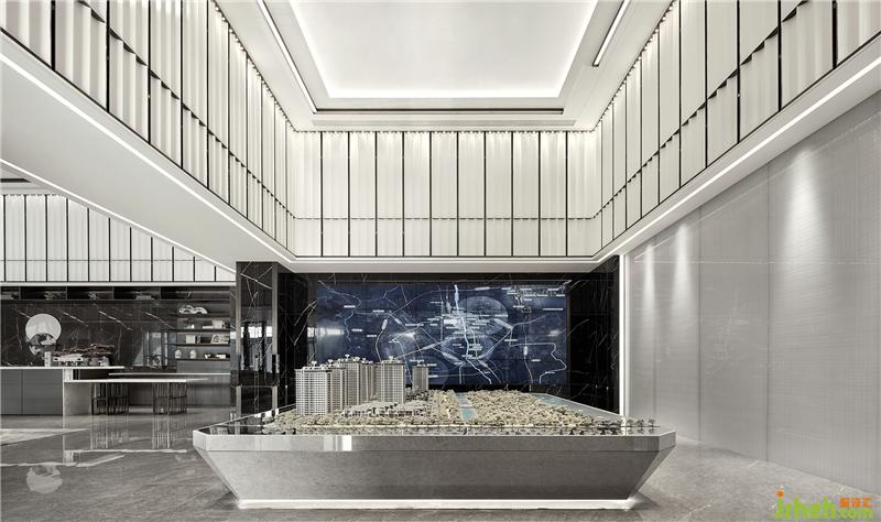 從門廳至洽談區(qū),沙盤落在空間之中,整個(gè)沙盤區(qū)線條簡(jiǎn)潔,層次分明,突出了運(yùn)河旁多樣住宅形制的樓盤特點(diǎn),簡(jiǎn)明意賅。
