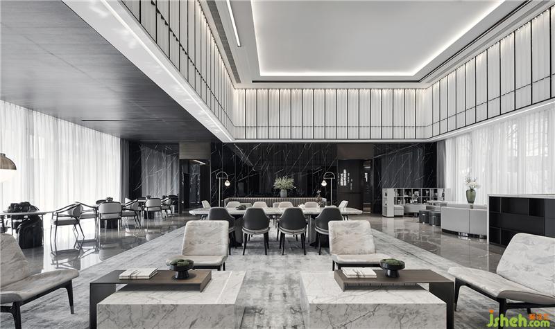 洽談區(qū)寬敞舒怡,光線通亮。意大利灰大理石地面從門廳延伸至此,墻面則選用色系穩(wěn)重、紋路清晰的保加利亞灰?guī)r板,平和的氛圍中帶著些許靈動(dòng)之氣。