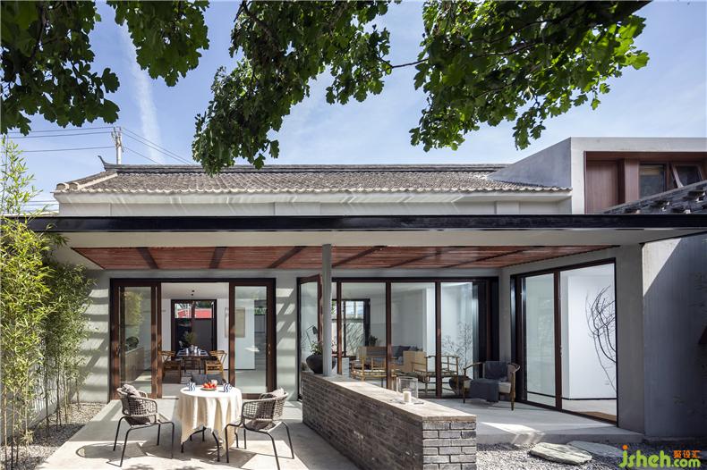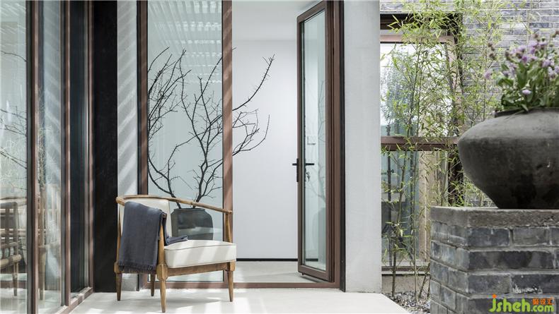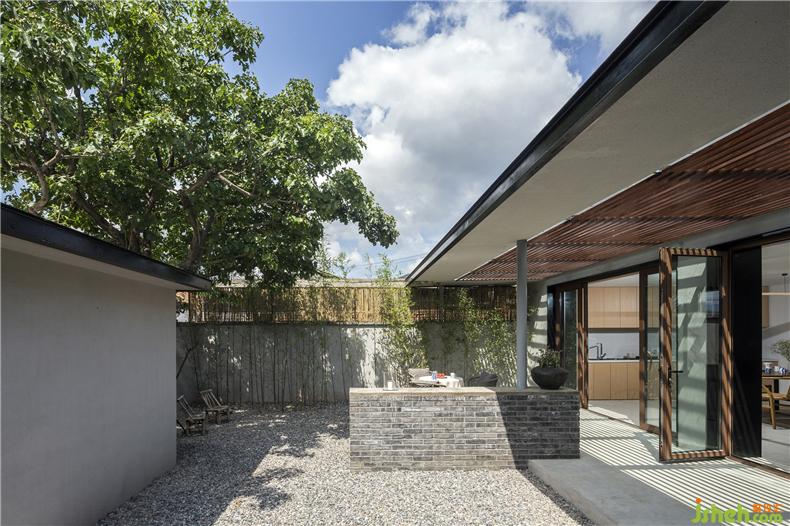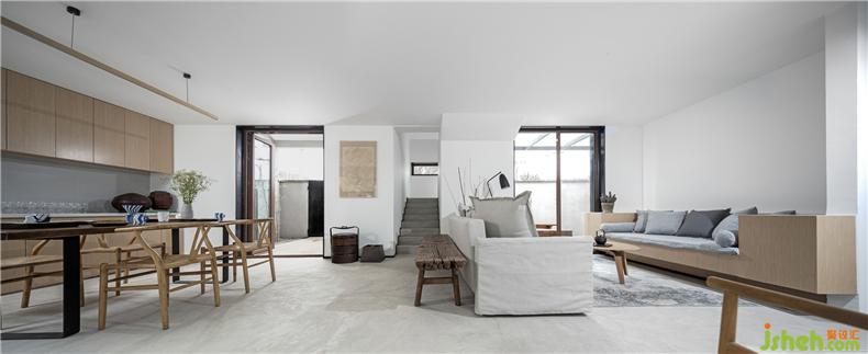 為了實現(xiàn)庭院視覺的穿透性和連貫性,建筑師以大面積玻璃作為首層南北立面的主要材料,置身室內(nèi),可觀春華秋實、晨昏霧靄,聽雨打石板地的清脆聲響,讓自然風光成為生活風景。而這種開放又與院外相隔,充分保障了居住空間的私密性,室內(nèi)設計師這也是對傳統(tǒng)民居內(nèi)向性審美的一種延續(xù)。