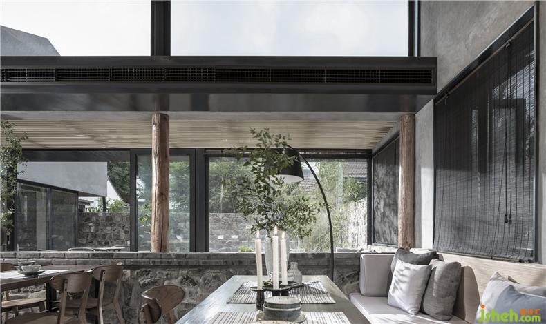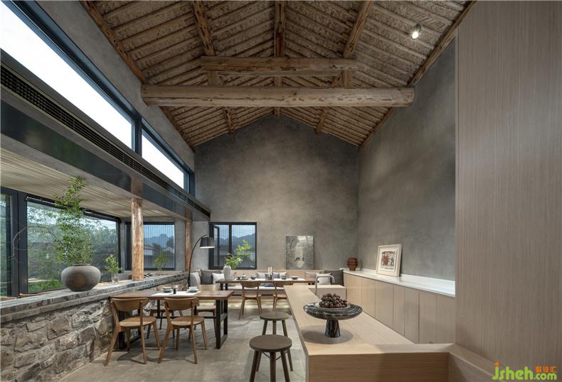 為了滿足商業(yè)屬性空間應(yīng)有的尺度感與使用靈活性,建筑師將坐北朝南的主體建筑加高至兩層并做了通高處理,容納室內(nèi)就餐活動(dòng)?!袄认驴臻g”由“紅果樹”延續(xù)至此,滿足半室外就餐的需求。而庭院之中,室內(nèi)設(shè)計(jì)師暖色編織質(zhì)感的沙發(fā)椅圍合出一種歡聚的氛圍,水泥花壇里野蠻生長(zhǎng)的綠植、竹子與石墻面為近景,矮山與藍(lán)天為遠(yuǎn)景,讓就餐的氛圍更加“原生態(tài)”。