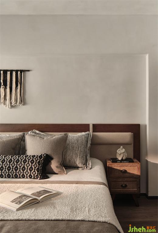 好的居住體驗離不開全時段的關(guān)照,回歸舒適柔和的臥室語境,人們向往更加私密、不被打擾的狀態(tài).在臥室空間中,民宿裝修設(shè)計以更細(xì)膩溫暖的奶茶色統(tǒng)領(lǐng)基調(diào),加入更多的棉麻和陶器的溫潤,在輕盈的二層空間營造出屬于個人的心靈港灣.