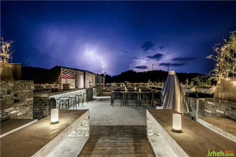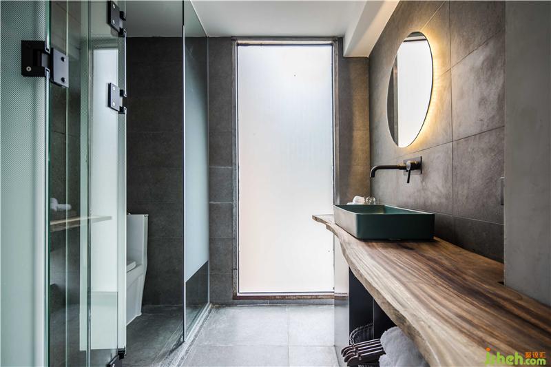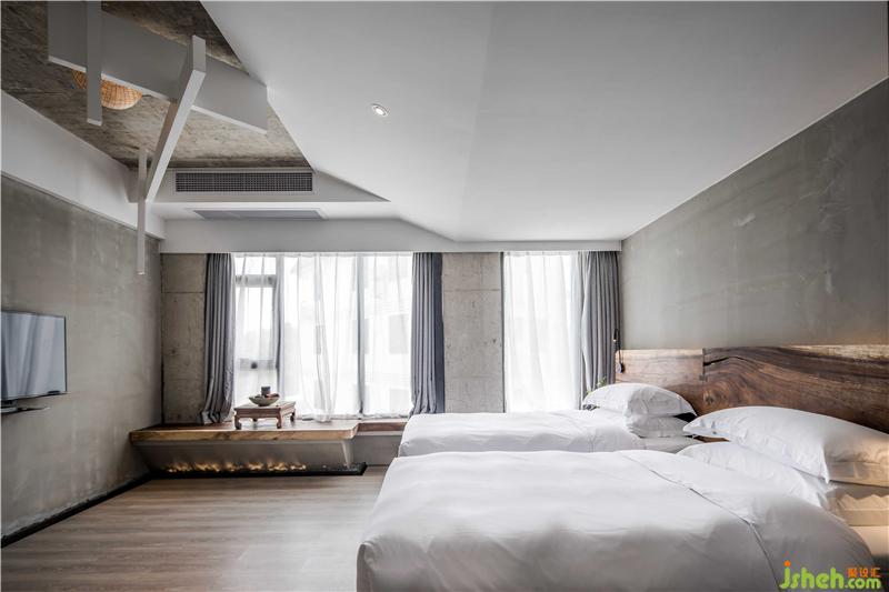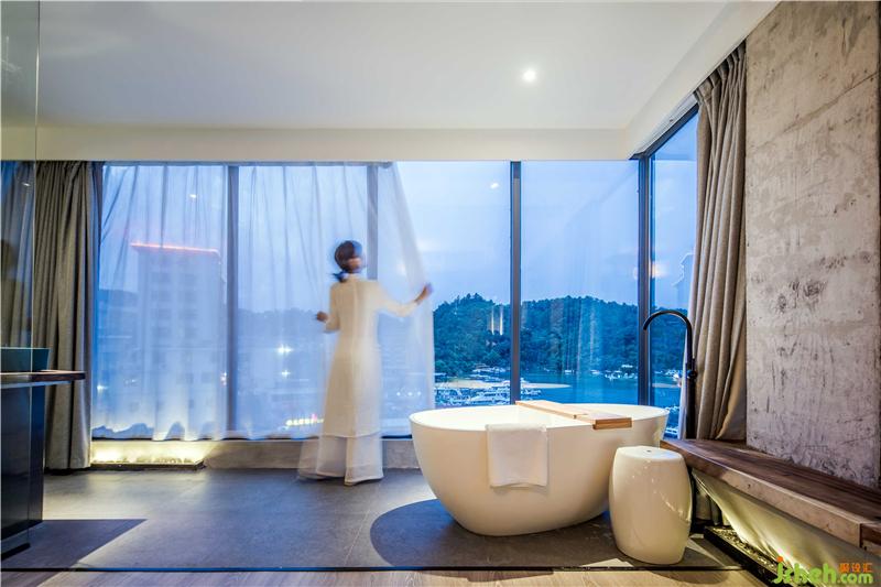 民宿的房間設計更多的考量了與萬綠湖的互動關系,在原有建筑格局當中,盡可能的使用了透明的光面玻璃,創(chuàng)造了看湖的條件。巨幅透明光亮玻璃的使用確保了看湖風景完整性的同時,也豐富了建筑面和自然的過渡,形成“框景”的效果。這種“框景”的限定,使從民宿每個房間看出去,都能找到屬于自己的那一片與眾不同的湖景。與直接開放式的建筑觀景視野相比,“框景”的限定增強了內(nèi)部建筑與自然的結合,使景色的被攝取更具視覺沖擊。民宿多以實木裝飾,實木材料帶來的厚重感與質感予人一種不同的感官體驗。家具陳設繼承了傳統(tǒng)家具的線條語言,深木色勾勒形成框架機體,與灰色墻面完成了很好的和諧。床尾凳打破床尾的單調(diào)呆板,增加臥區(qū)空間的含蓄感。衛(wèi)浴區(qū)大型玻璃落地窗引進風景,泡浴山湖陪侍,何等愜意。每個房間內(nèi)置了大小不同的茶臺,一為客家以茶會八荒,二為希望來客在這綠水青山中,聞香品茗,找到屬于自己的靜謐。
