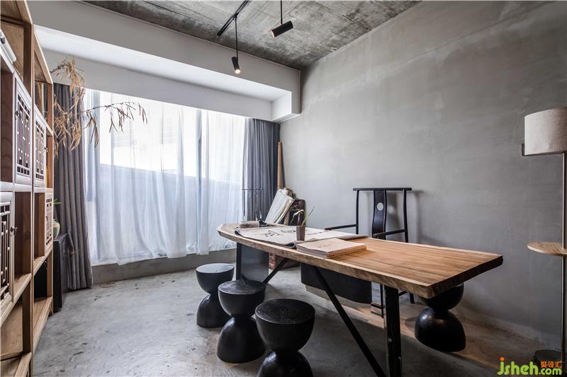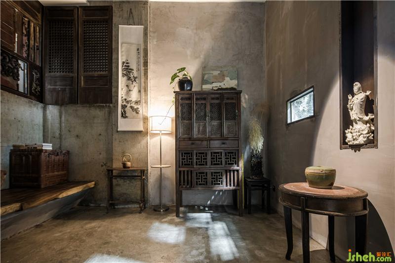簡約是大堂的調(diào)性,進門左側瓶中放置蘆葦插飾,休息區(qū)以沙漏狀黑色矮凳標識出來,配合充滿懷舊氣息的銅壺和茶碗意境十足。點睛之筆是墻上交錯對仗的黑色置物格里的茶葉罐。意為以茶會友,左右以建筑豎中軸線為分割,劃分成不同的功能區(qū)。玻璃外立面與“心·谷”生態(tài)缸相呼應,自然光由外入內(nèi),形成更加通透的空間視覺。休息區(qū)面對接待臺,陳舊的老樹木根年代感十足,環(huán)繞臺前。電梯左側墻面的金屬鏡面反射裝飾陳設,擴大了視覺面積。不規(guī)則條狀燈掩蓋吊頂?shù)目瞻?,輝映其中。婉約的茶師佳人素手制茶,質感十足的銅壺煮開沸水,澆灌至蜷縮的茶葉上便茶香四溢,香煙裊裊,思緒像是飄至遠山,輕松自在,悠然愜意。