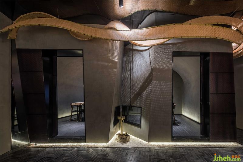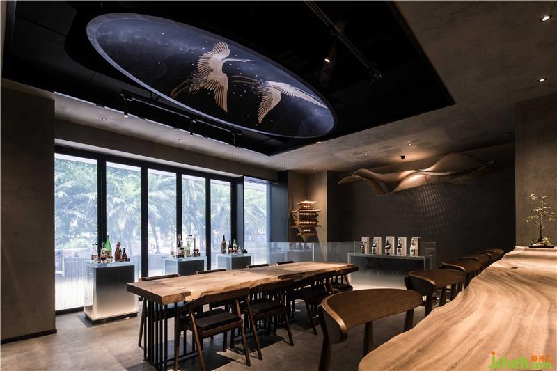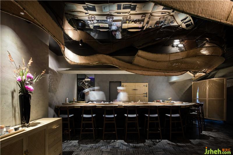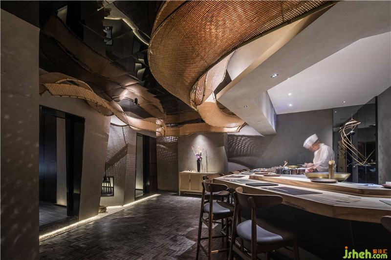 本項(xiàng)目位于廣州最繁華的淘金路街道,是一家類懷石風(fēng)格的日式料理店。懷石料理簡單而雅致,同時講究環(huán)境的清幽,茶食“和敬清寂”,尊崇自然,更多強(qiáng)調(diào)包容性。為更加的體現(xiàn)出日式料理中食物自身的特色,《旨匠》在設(shè)計(jì)上采取了極簡的裝修風(fēng)格,大面積使用灰調(diào)背景色營造出幽靜氛圍,淺色延綿的竹元素裝置增加觀感的體驗(yàn)度,竹元素一直以來都是日本文化中非常富有代表性的元素之一,也能更好體現(xiàn)主旨??珜?shí)木桌椅打破沉悶,與頂部設(shè)計(jì)巧妙的竹裝置呼應(yīng),在富有層次感的燈光效果中,使人能夠更加沉浸于美食與環(huán)境的輕松與愉悅之余,目光更集聚于光源的聚焦點(diǎn):Omakase日料大師的手作過程,巧手翻覆間佳肴天成。餐廳裝修設(shè)計(jì)