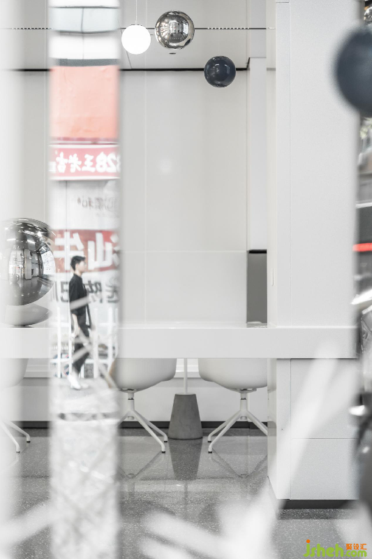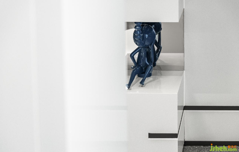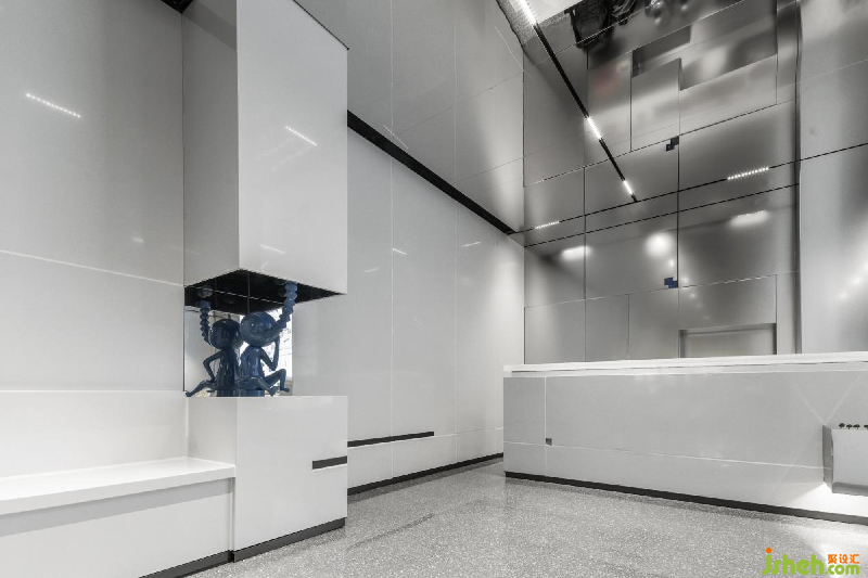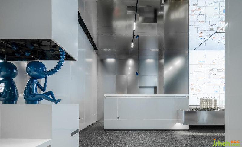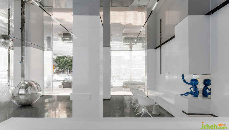 空間主色調(diào)為白色,配以鏡面和不銹鋼,打造跨越時代的未來感。藍色的趣味玩偶處于柱體中央