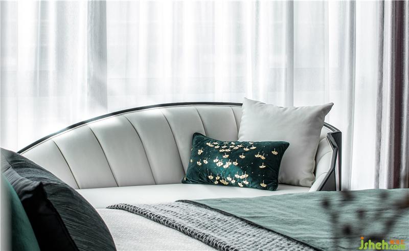 少則不及,多則繁雜。設(shè)計(jì)師摒棄了過(guò)多的元素堆砌,創(chuàng)設(shè)性地在居住空間點(diǎn)綴水綠色,為空間添加一抹奪目耀眼的明媚。“春樓不閉葳蕤鎖,綠水回連宛轉(zhuǎn)橋”,水綠色的運(yùn)用更是使墻的邊界變得無(wú)限模糊,窗外景色與室內(nèi)設(shè)計(jì)自成一景,江風(fēng)輕語(yǔ)入夢(mèng)來(lái),春水共庭院一色。