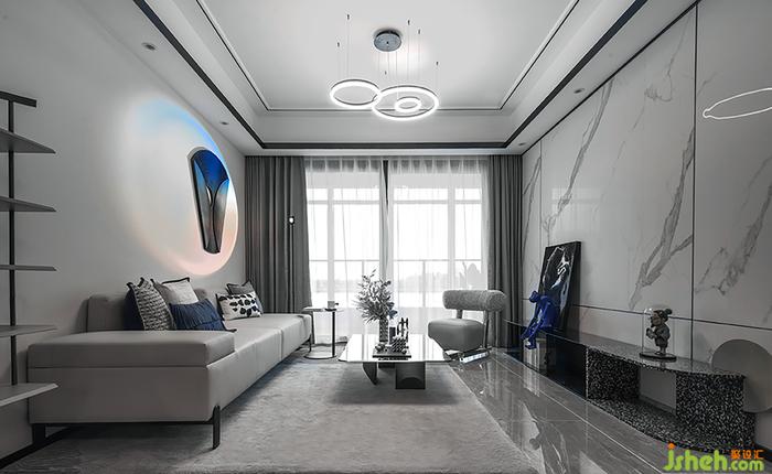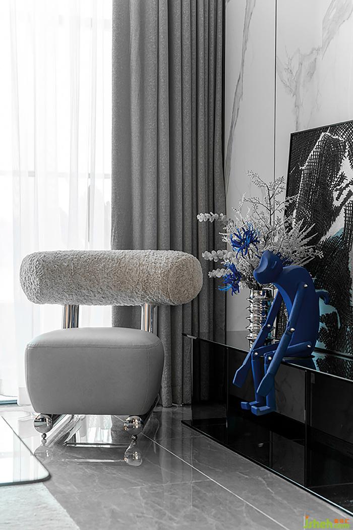 造型新奇的絢麗燈飾,光亮的金屬,打破咖色木材質(zhì)和大理石材質(zhì)的中性,樣板間設(shè)計(jì)讓空間的氛圍趣味且跳脫,打破了同質(zhì)化的設(shè)計(jì)思維所帶來(lái)的沉悶與無(wú)味,構(gòu)建藝術(shù)與功能并行的會(huì)客空間。