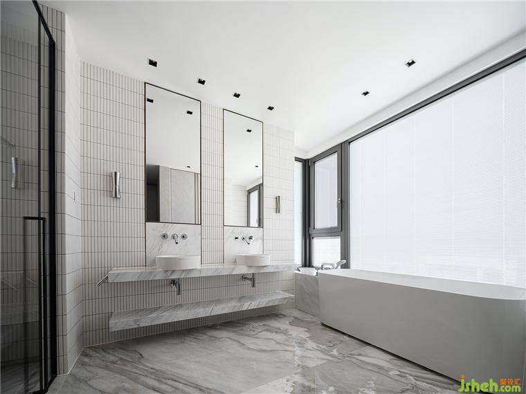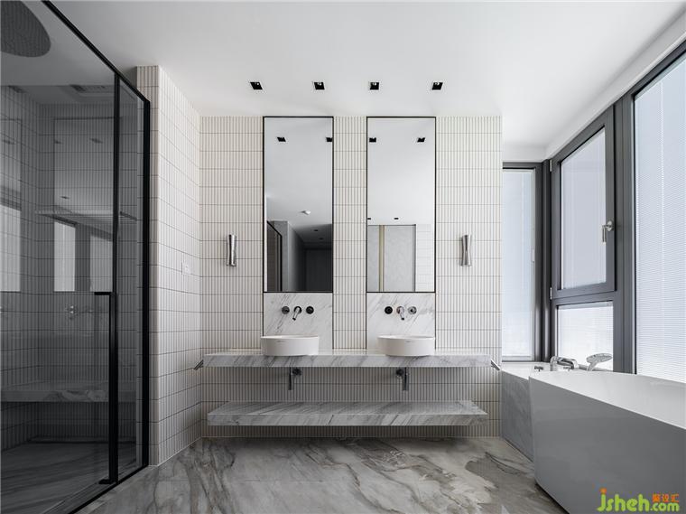 主臥里配套設(shè)置了衛(wèi)生間,開放的洗漱區(qū)能承載更多的功能性,細(xì)心的豪宅設(shè)計讓一切緊湊卻不擁擠。橫平豎直的線條,仿佛在訴說著一個干凈利落的空間故事。