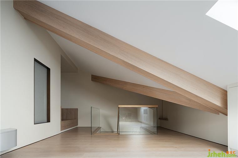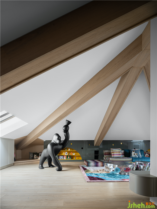 三層的閣樓上,豪宅設(shè)計師保留了原始三角頂結(jié)構(gòu),通過對稱式開天窗,在空間的體塊與樓層之間,尋找一種趣味,由此創(chuàng)建自在的尺度。