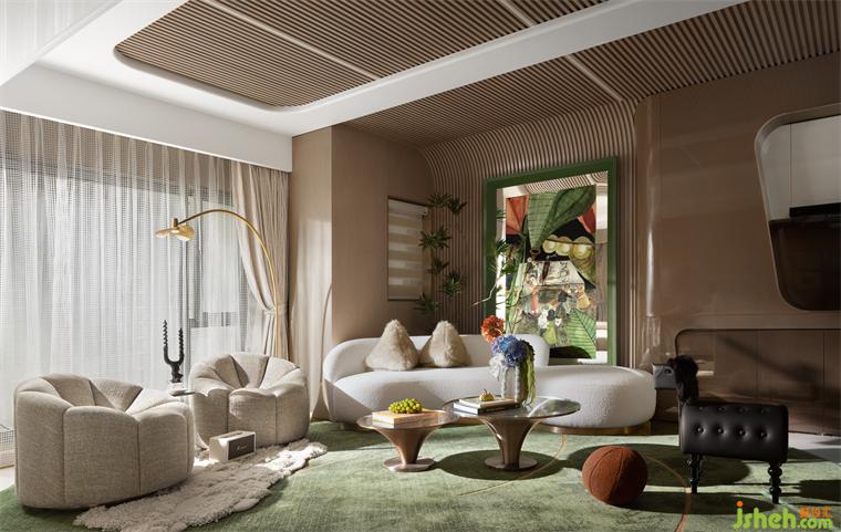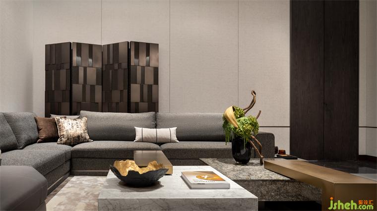 客廳軟裝的色彩管理上,樣板間設(shè)計以灰咖與白為主色調(diào),暖色調(diào)的黃色點綴在其中,形成整體統(tǒng)一的視覺效果。